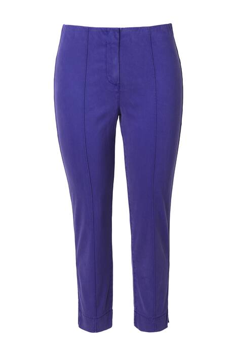Kalhoty, úzký střih, s prošívaným plisováním a krátkými rozparky na lemu. Elastický pas, zapínání na knoflík a zip.