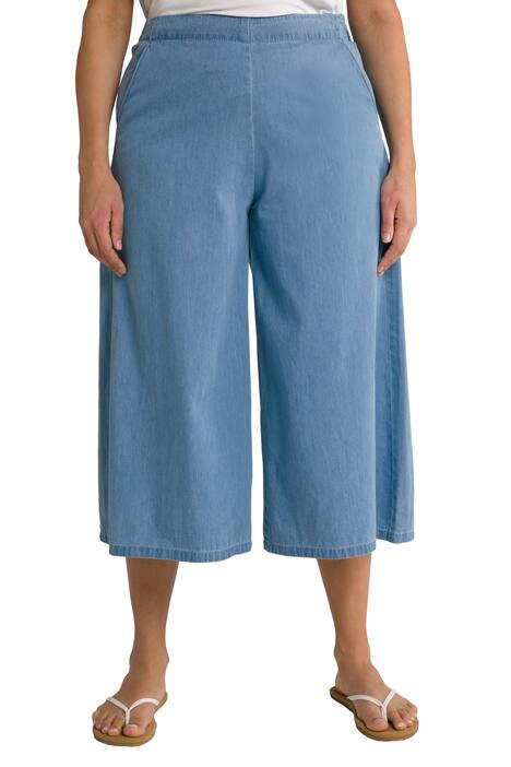 Kalhotová sukně s širokými nohavicemi. Částečně elastický pas s postranním zipem a 2 kapsami.