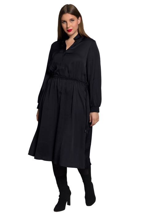 Saténové šaty, midi šaty ženského střihu s jemným leskem. Otevřený stojáček s výstřihem do V a ozdobným švem. Stahovací šňůrky po stranách v pase. Rozšířená sukně. Dlouhé rukávy s elastickými manžetami.