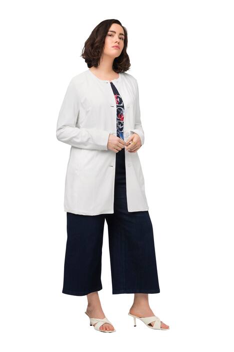 Dlouhý blejzr z velmi kvalitního žerzeje s ozdobnými švy. Kulatý výstřih, knoflíková léga a decentní kapsy ve švu. Dlouhé rukávy.