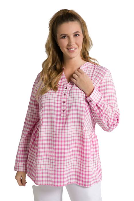 Kostkovaná tunika, Classic střih, s otevřeným límečkem a krátkou knoflíkovo légou. Po stranách diagonální vsadky, dlouhé rukávy s ohrnutím na 3/4 délku.
