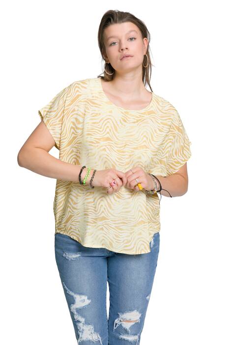 Halenkové tričko se zebra potiskem, kulatý výstřih a padlá ramena. Zaoblený lem, vzadu delší.
