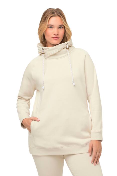 Mikina se širokým stojáčkem a vázací stuhou. Sportovní raglánový střih s kapsami v dělících švech. Dlouhé rukávy s žebrovanými manžetami. OEKO-TEX.