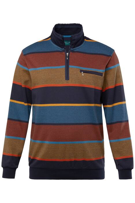 Troyer Boston Park z měkké teplákoviny s pruhy. Límec se zipem, náprsní kapsa na zip s lemovkou. Žebrované manžety. Boston Park – stylový v každé velikosti. Náš nový, kompletně přepracovaný střih Vás přesvědčí.