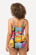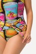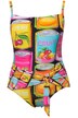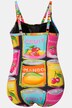 Plavky s měkkými košíčky, barevný potisk ovoce a nařasená ozdobná stuha v pase. Špagetová ramínka, pás pod prsy, přední podšívka. Vyrobeno s recyklovanými materiály.