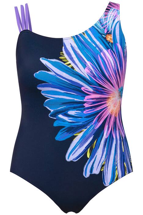 Plavky s měkkými košíčky a velkou barevnou sedminkráskou na boku. Vpravo trojdílné ramínko. Pás pod prsy, přední podšívka.