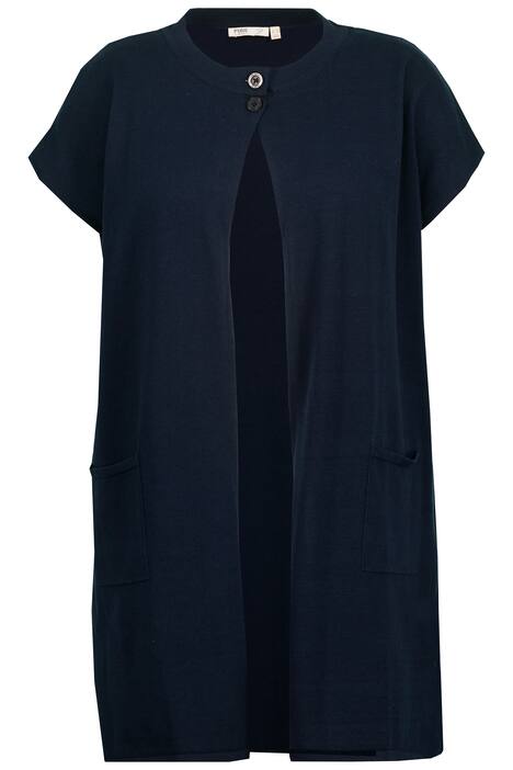 Pletená vesta z biobavlny. Měkký melanž úplet, oversize, se stojáčkem a zapínáním na knoflíky. Padlá ramena. 2 kapsy, dlouhé postranní rozparky. Organic; certifikováno ECOCERT Greenlife licence č. 152026.
