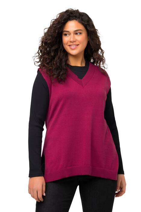 Svetr bez rukávů s hlubokým výstřihem do V a dlouhými postranními rozparky na žebrovaném lemu.
