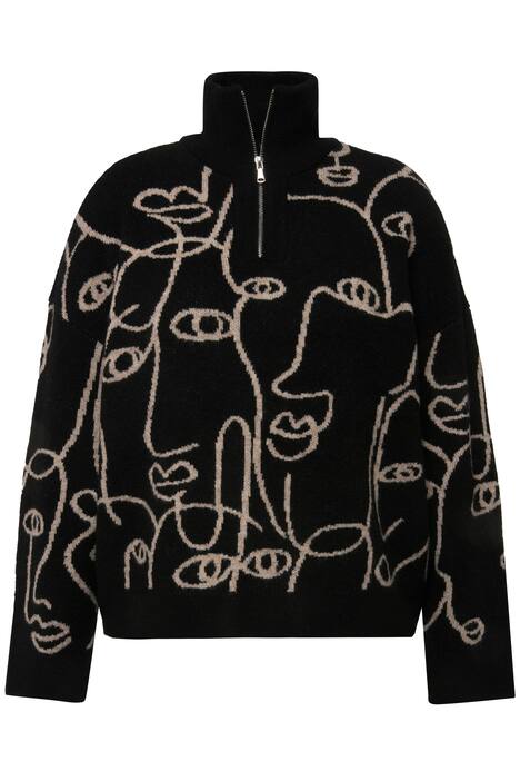 Troyer, oversize, z měkkého žakárového úpletu s motivem siluet. Díky kvalitní žakárové technice bez volných vláken. Stojáček se zipem, padlá ramena, dlouhé rukávy.