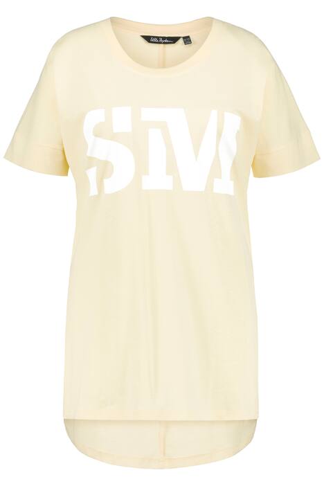 Oversize tričko s nápisem SMILE kolem dokola. Kulatý výstřih, padlá ramena, krátké rukávy s ohrnutím. Lem vzadu zaoblený, asi o 12 cm delší.