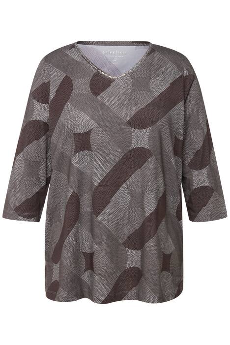 Tričko, A střih, z jemné Pima bavlny s grafickým plošným designem. Výstřih do V s ozdobnými kamínky, 3/4 rukávy, postranní rozparky pro hladce splývavý vzhled a ještě větší svobodu pohybu.