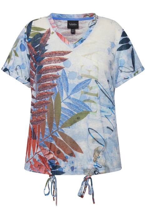 Tričko, Relax střih, s trendy lístkovým potiskem. TOP: vázací stuhy k řasení na lemu - pro Vaši vysněnou siluetu. Výstřih do V, padlá ramena s ohrnutím.