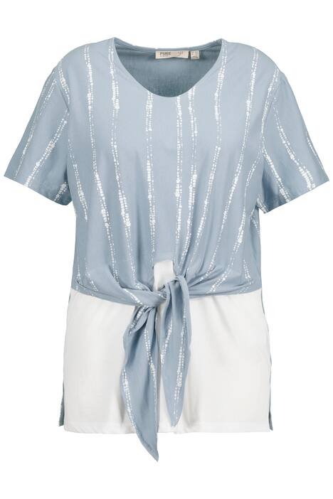 Tričko z biobavlny. Relax střih v moderním vzhledu 2v1 - horní díl s potiskem a ozdobnou mašlí vpředu. Pod tím jednobarevný díl. Zaoblený výstřih do V, krátké rukávy. Organic; certifikováno ECOCERT Greenlife licence č. 152026.
